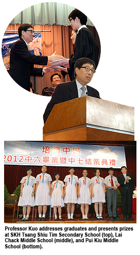 Professor Way Kuo was addressing F6 and F7 graduates at SKH Tsang Shiu Tim Secondary School, Lai Chack Middle School and Pui Kiu Middle School between 1 June and 3 June.