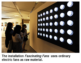 Among the installations is one called Fascinating Fans by Ho Ka-ling, a graduate of the Bachelor of Arts (Hons) in Creative Media. Projecting beams of light on a few dozen small fans measuring around 10cm in diameter each, she has produced a colourful and dazzling installation that shows art is not esoteric or detached from us. She said, “Beauty is often hidden in daily objects. Very few people attempt to uncover the potential in these objects. I hope to remind all of us that art in fact resides in our daily life.”