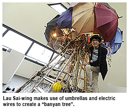 Another graduate, Lau Sai-wing, bemoans the increasing distance between city dwellers and nature, which prompted him to use umbrellas and electric wires in his installation, Small Banyan. He said, “When I was little, I used to play under a banyan tree with my sister and my cousins. We did not feel the need for other gadgets, and we had great fun. But the children around us these days are surrounded by electric products. They do not even know how to climb trees.” On his artificial banyan tree, he hung his childhood toys. Viewers are invited to climb up the tree to visit his “secret haunt” using the four ladders provided.