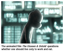 There is a stop-motion animated film, The Untold & Unseen, created by artist Lam Ho-tak. He finds that some of his friends live only to work and eat. When one works only to survive and survives only to work, one becomes a soul-less machine. He asks, “Is there a better way to live?” At the end of the film, the protagonist walks out of his tunnelled world and explores the world outside, which is yet unknown to him.