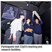 In the morning session, participants were divided into six groups and visited state-of-the-art teaching and research facilities at CityU, including the Gateway Education (GE) Laboratory, the Discovery-enriched Curriculum (DEC) Laboratories, the Plasma Laboratory, Laboratory of Transgenic Medaka, the “Pure Land: Inside the Mogao Grottoes at Dunhuang” exhibition, the 3D-TV Virtual Studio, the Moot Court, and the Run Run Shaw Library.