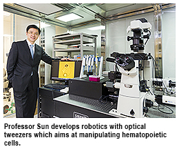 The cross-disciplinary research team led by Professor Sun has been collaborating with the University of Hong Kong to develop an innovative cell manipulation and testing system by integrating technologies of robotics, optical tweezers and microfluidics. The system can be used to probe the functional mechanism of hematopoietic cells, which can foster the development of treatment for blood diseases.