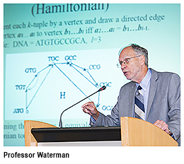 Professor Waterman, who holds an Endowed Associates Chair in Biological Sciences, Mathematics and Computer Science, discussed how “big data” from the next generation of DNA sequencing technologies has radically changed the techniques that were successfully used in the Human Genome Project (HGP) in 2002. The goal of HGP, he said, was to discover the sequence of the chemical base pairs that make up human DNA, and to identify and map all of the genes of the human genome.