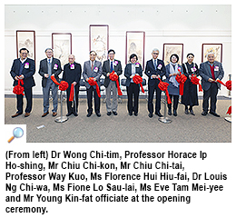 Ms Florence Hui Hiu-fai, Under Secretary for Home Affairs; Dr Louis Ng Chi-wa, Deputy Director of Leisure and Cultural Services (Culture), the Leisure and Cultural Services Department; Ms Fione Lo Sau-lai, Director of the Hong Kong Heritage Museum; Ms Eve Tam Mei-yee, Director of the Hong Kong Museum of Art; Mr Chiu Chi-kon and Mr Chiu Chi-tai, sons of Professor Chao; and Mr Young Kin-fat, President of To-day’s Chinese Art Association and a well-known Lingnan painter, officiated at the opening ceremony on 2 March. Lingnan is a school of painting from southern China.