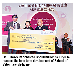 City University of Hong Kong (CityU) held the Donation & Establishment Ceremony for the “Li Dak Sum & Yip Yio Chin Development Fund for Veterinary Medicine” on 14 March in gratitude for the HK$100 million donation made by the acclaimed business leader Dr Li Dak-sum.