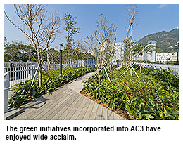 The green initiatives incorporated into AC3 have enjoyed wide acclaim. As early as 2012, it received a merit award in the New Building-Hong Kong (Building Under Construction) category of the Green Building Award.The philosophy of sustainable development was evident across the entire building project: from the design concept, roof garden and cross ventilation system to the use of environmental-friendly materials and energy-efficient building features as well as the application of renewable and recycling technologies.