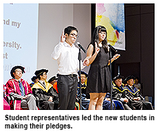 Winnie Wong Oi-man, a Year 4 student from the College of Business, and Siu Ho-ming, a Year 4 student from the College of Science and Engineering, led the new students in pledging to live their student lives at CityU to the fullest and to do their best at all times. They vowed to broaden their horizons and seek new knowledge.