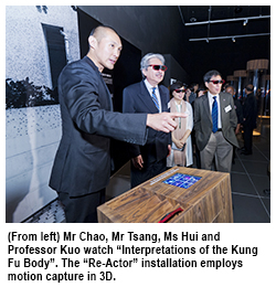 Officiating guests at the opening ceremony held at the Hong Kong Heritage Museum on 1 September included The Honourable John Tsang Chun-wah, Financial Secretary of HKSAR; Ms Florence Hui Hiu-fai, Under Secretary for Home Affairs; Mr Hing Chao, Founder of Hong Kong Culture Festival, Executive Director of IGA; Professor Way Kuo, CityU President; Mr Lee Shek-lin, Chairman of the Hakka Kung Fu Culture Research Society; Professor Jeffrey Shaw, Director of the Centre for Applied Computing and Interactive Media (ACIM), CityU; and Professor Sarah Kenderdine, University of New South Wales.