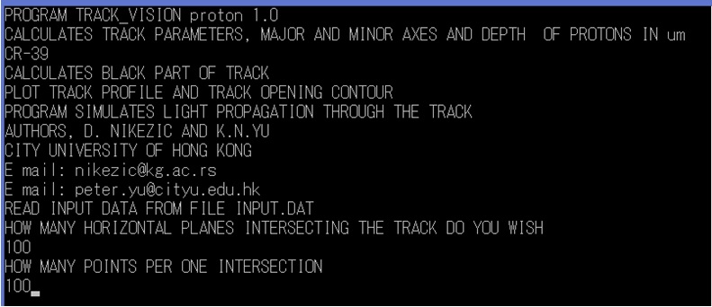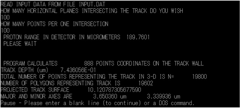 (2) Change these input parameters as you need and then save the file. Double-click on the Track_p.exe file to run it. The program will ask the user to define the resolution for graphical presentation, i.e., the number of horizontal planes which intersect with the track body and the number of points per one cross section. We recommend "100" for both. A larger number will slow down the calculations, while a smaller number will produce poorer-quality graphical presentations.