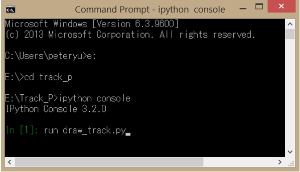 Invoke the IPython console by typing "IPython console" at the command prompt E:\Track_p>.