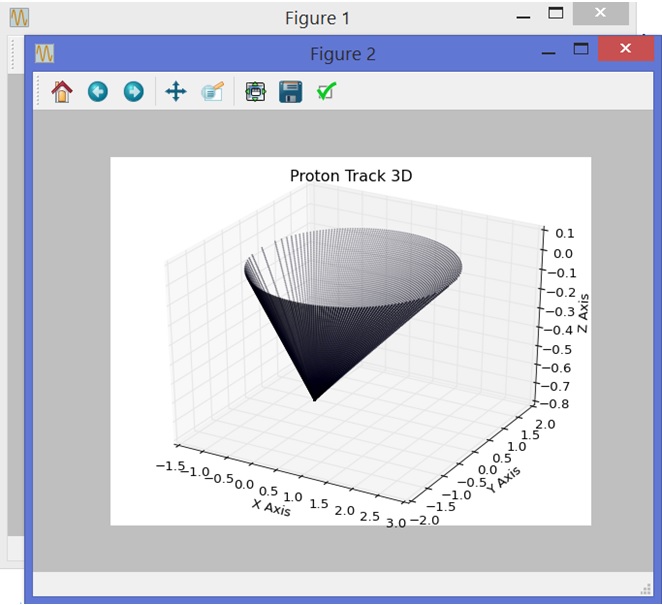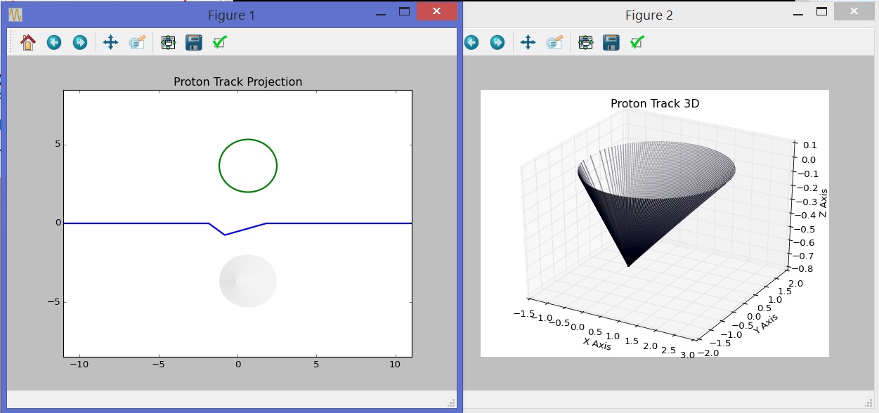 The first one (Figure 1) represents the projection of the proton track in 2D, while the other (Figure 2) shows the projection of the same track in 3D.