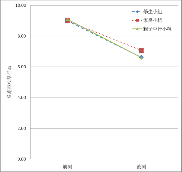 與家長(zhǎng)參與小組前比較,小組結(jié)束後學(xué)童的反應(yīng)型攻擊行為有顯著減少。 親子平行小組