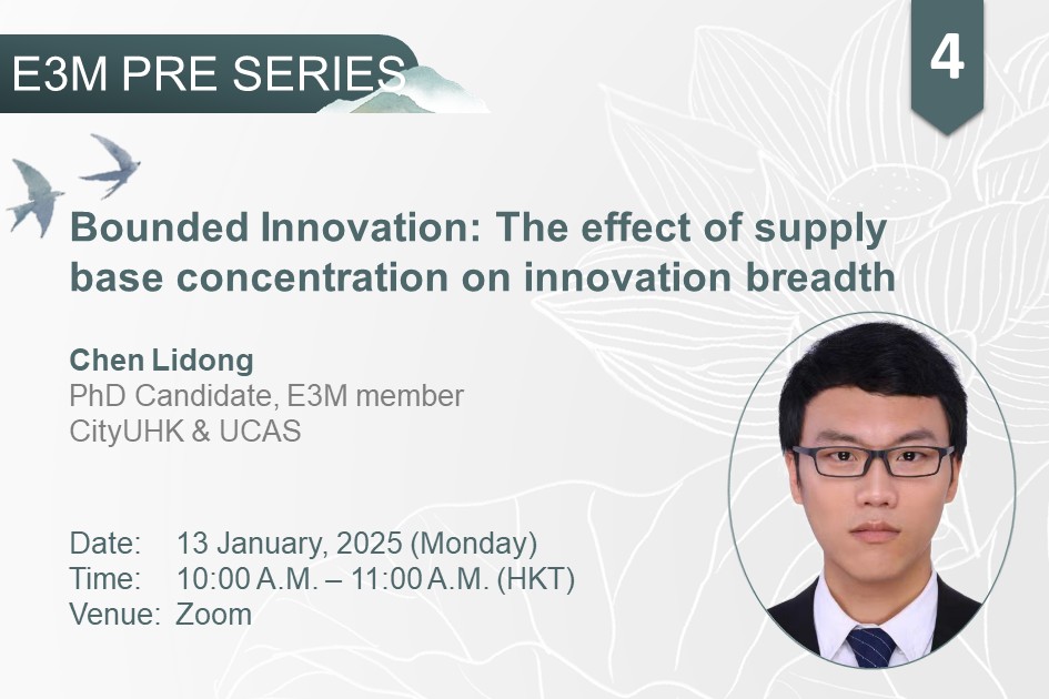 PhD Candidate Chen Lidong from E3m will share his working paper about the effect of supply base concentration on innovation breadth.