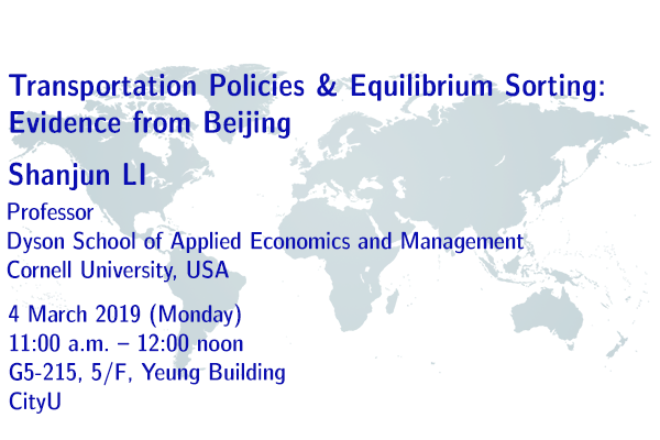 Prof. Shanjun Li is the Kenneth L. Robinson Professor of Applied Economics and Management at Cornell University. On Monday, he will present the latest research findings on Transportation Policies & Equilibrium Sorting. Stay tuned. [Mar. 2019]