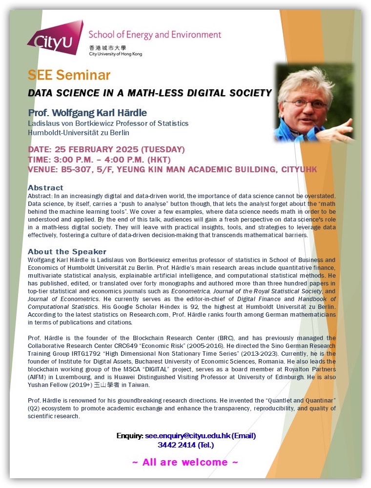Wolfgang Karl H?rdle, Ladlislaus von Bortkiewicz Professor of statistics, from the School of Business and Economics, Humboldt-Universit?t zu Berlin, will visit CityUHK to deliver a seminar titled "Data Science in a Math-Less Digital Society" on February 25, 2025. All are welcome!