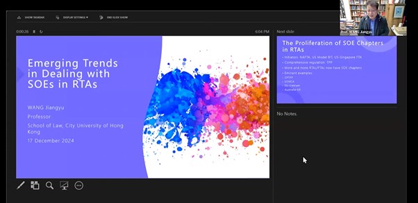 Prof. Wang identified key emerging trends in SOE governance within RTAs, including broader scope, detailed provisions, competitive neutrality, promotion of good governance, and robust enforcement mechanisms. He underscored the necessity of multilateral cooperation for effectively managing SOE challenges within global trade frameworks.