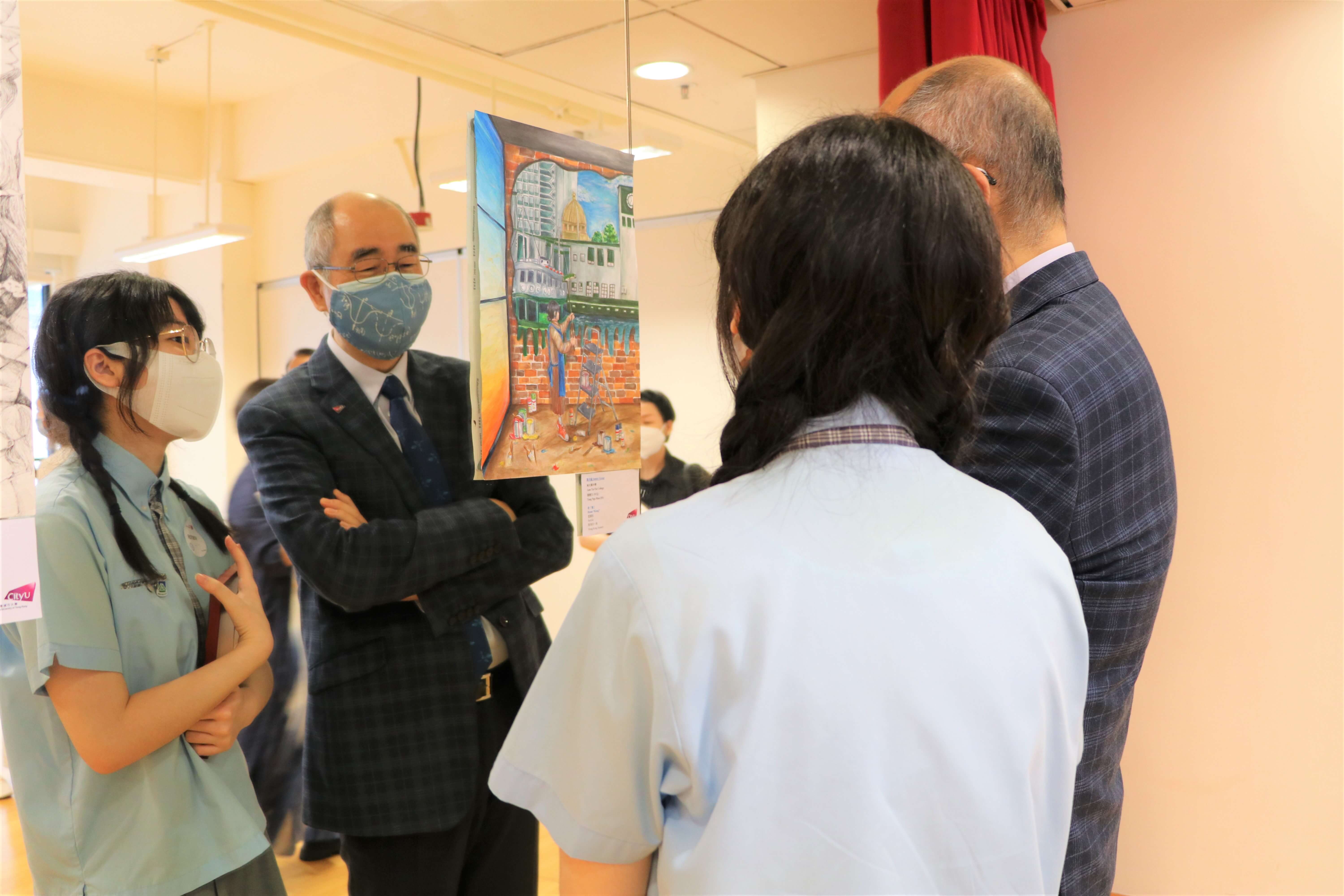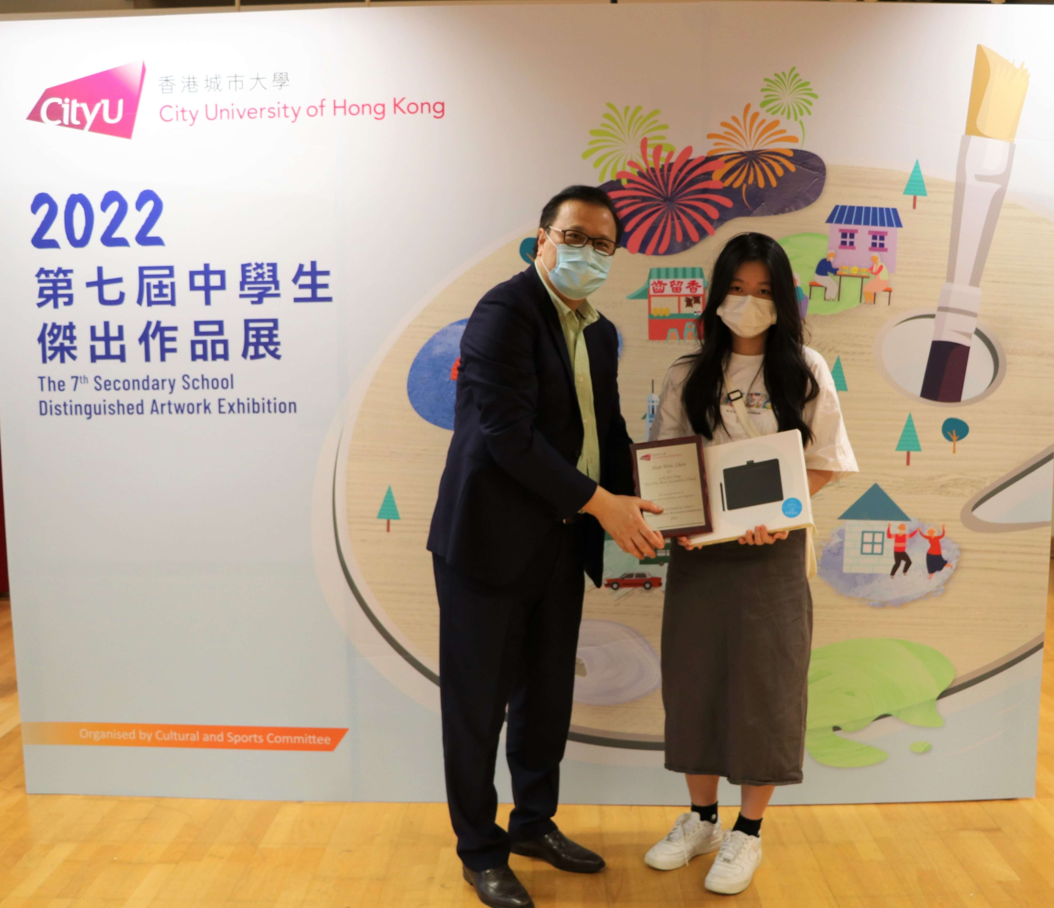 This year, the 7th Secondary School Distinguished Artwork Exhibition 2022 has selected 66 distinguished artworks from 88 secondary schools, while six extraordinary paintings have been awarded the 'Outstanding Award'. On 22 April 2022, the awardees and their nominators were invited to the Outstanding Award Ceremony. They received the awards from Professor Raymond CHAN, Vice President (Student Affairs), and Dr Tim WONG, Director of Student Development Services.