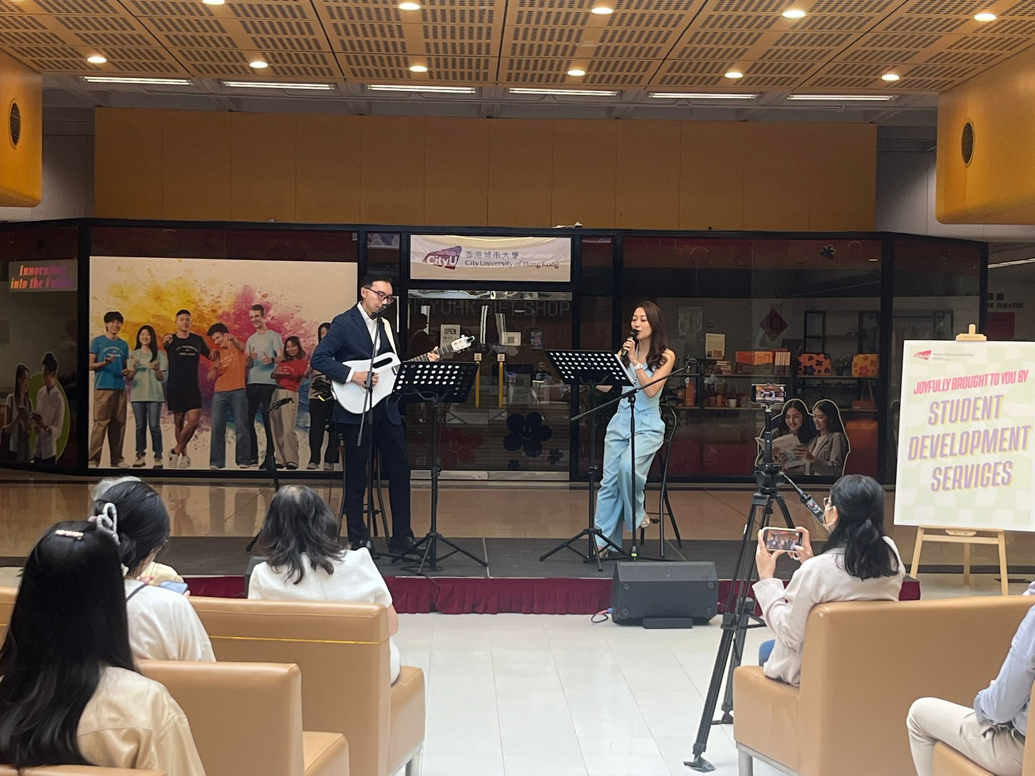 The event featured Professor Sunny LEE, Senior Director, Office of the President, CityUHK; and Ms. Ada PONG, a singer and YouTuber, along with their band "Strings and Harmony." They delivered a captivating performance with a selection of popular hits, including Bruno Mars' Talking to the Moon, Lady Gaga's Shallow, Laufey's From the Start, etc. Their enchanting melodies infused CityUHK students with positive energy, leaving the audience in awe and prompting enthusiastic calls for an encore, which brought the concert to its climax.