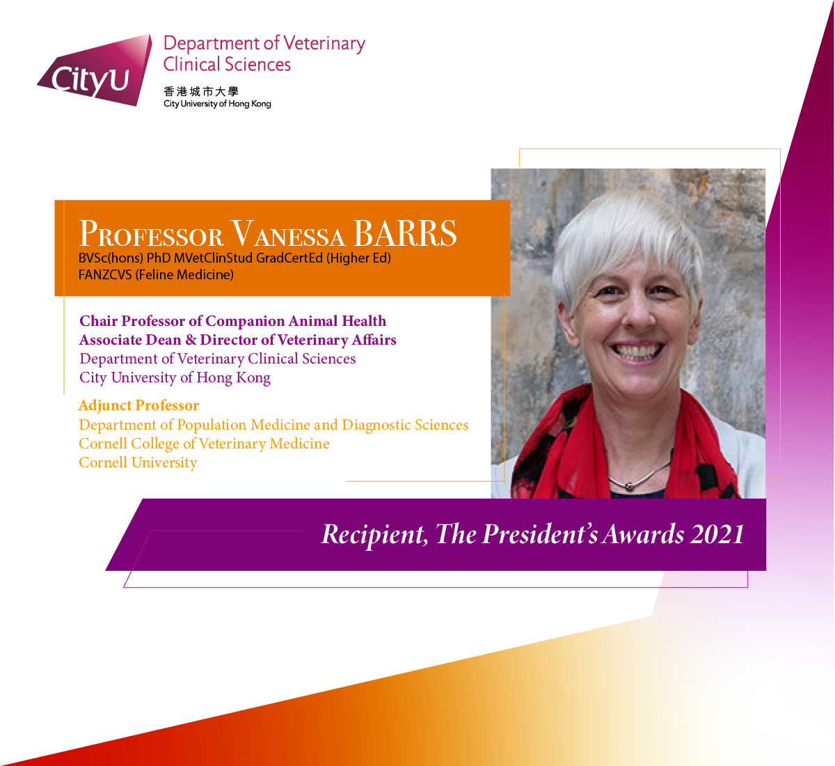 We are proud to share the news that our Chair Professor Vanessa Barrs has been named the Recipient of The President's Award 2021 along with other 6 outstanding faculty at the City University of Hong Kong, in recognition of their remarkable achievements in their respective academic arena in support of the University's enhancement and development.