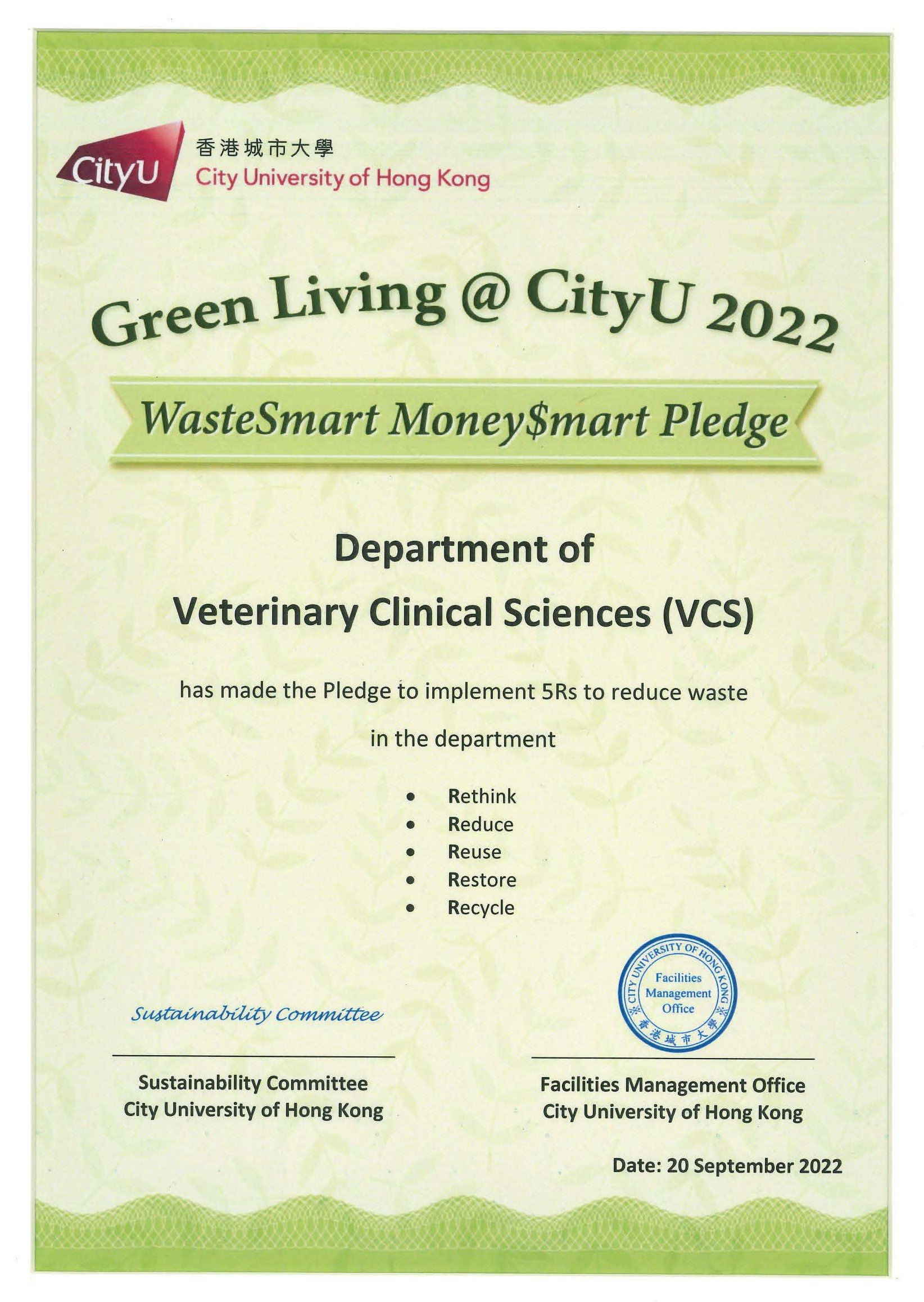 The Department of Veterinary Clinical Sciences (VCS) is implementing the 5Rs: Rethink, Reduce, Reuse, Restore, Recycle. We have signed up to the CityU's WasteSmart Money$mart Pledge, and the CityU Green Footprint Pledge to demonstrate our commitment to preserve a Bottled Water Free campus.