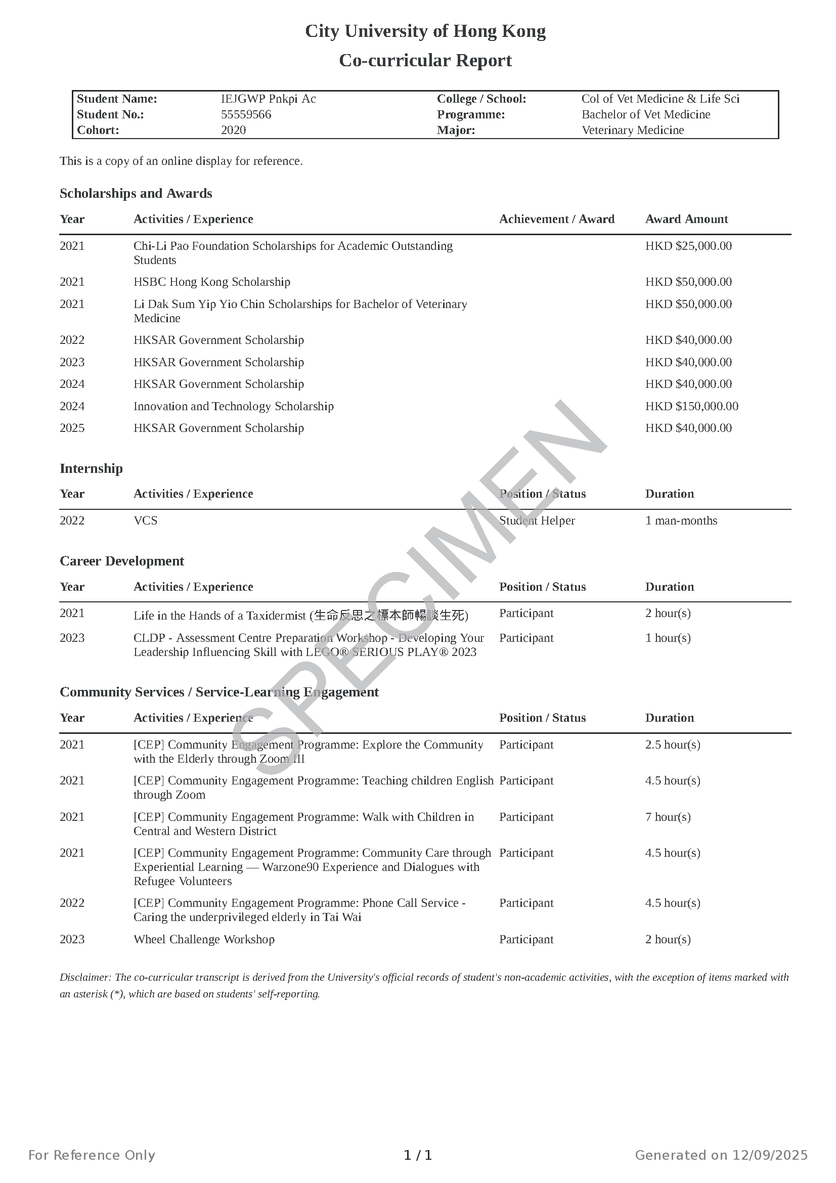 non-academic e-Certificate that records the non-credit-bearing activities/achievements of the students, like community services, summer internships, etc. It is
