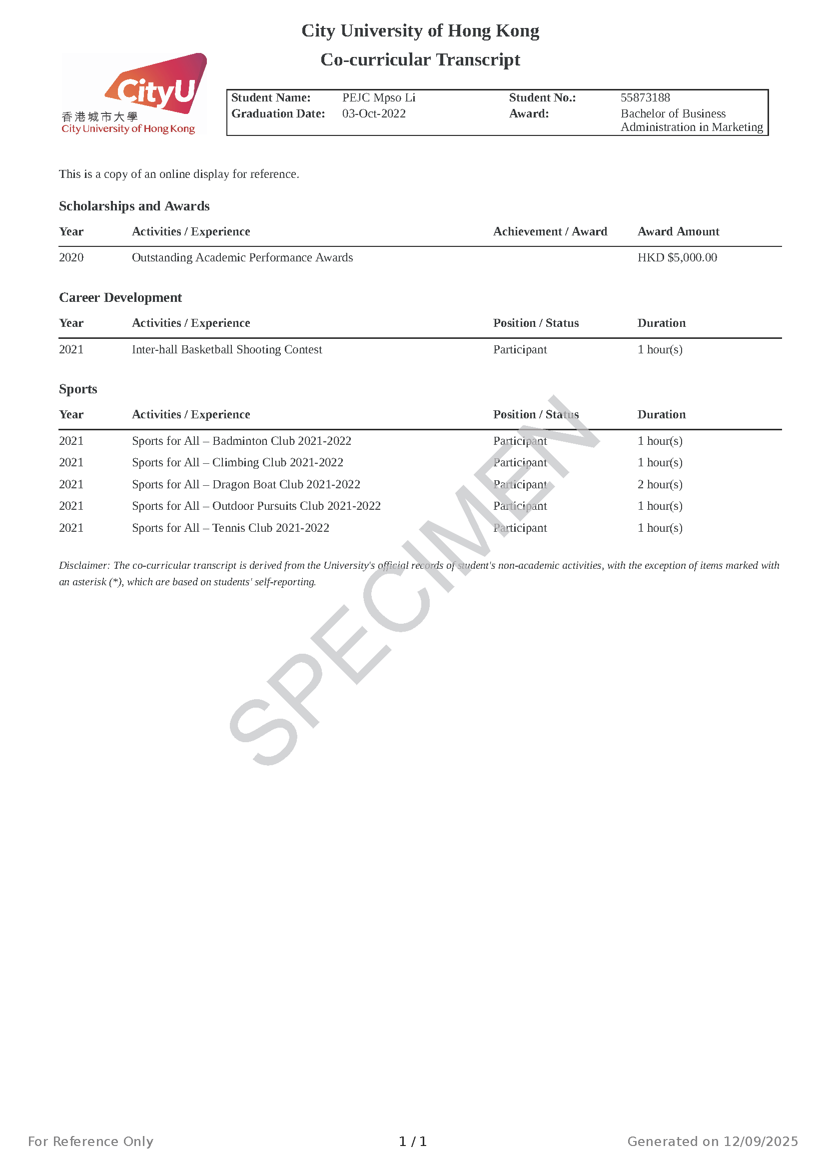 Should you have any questions or comments on the Co-curricular Transcript, please feel free to contact us by phone at 3442 9225 or by email at