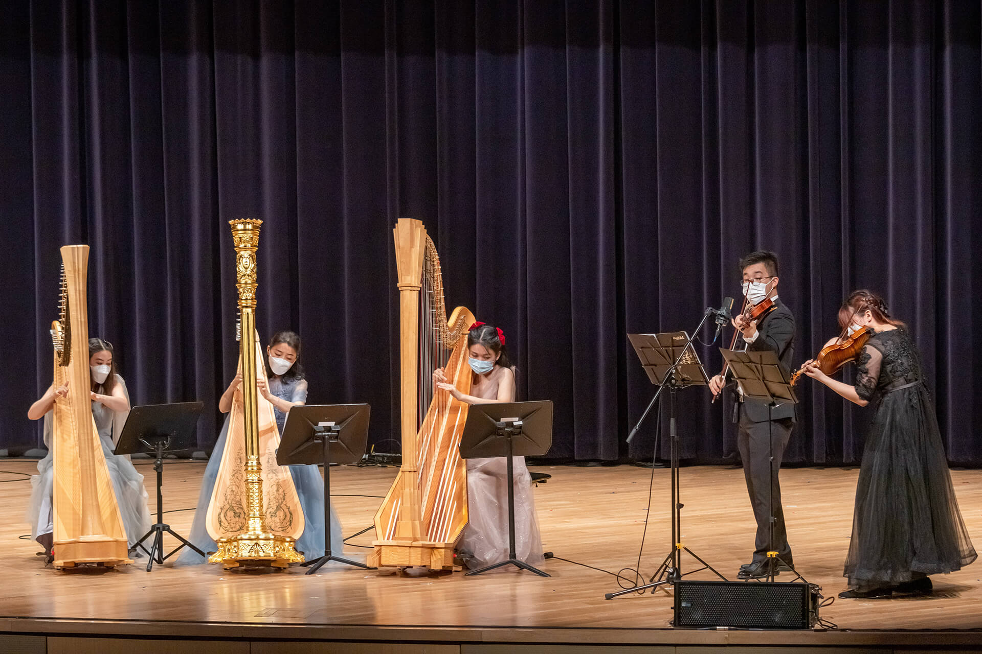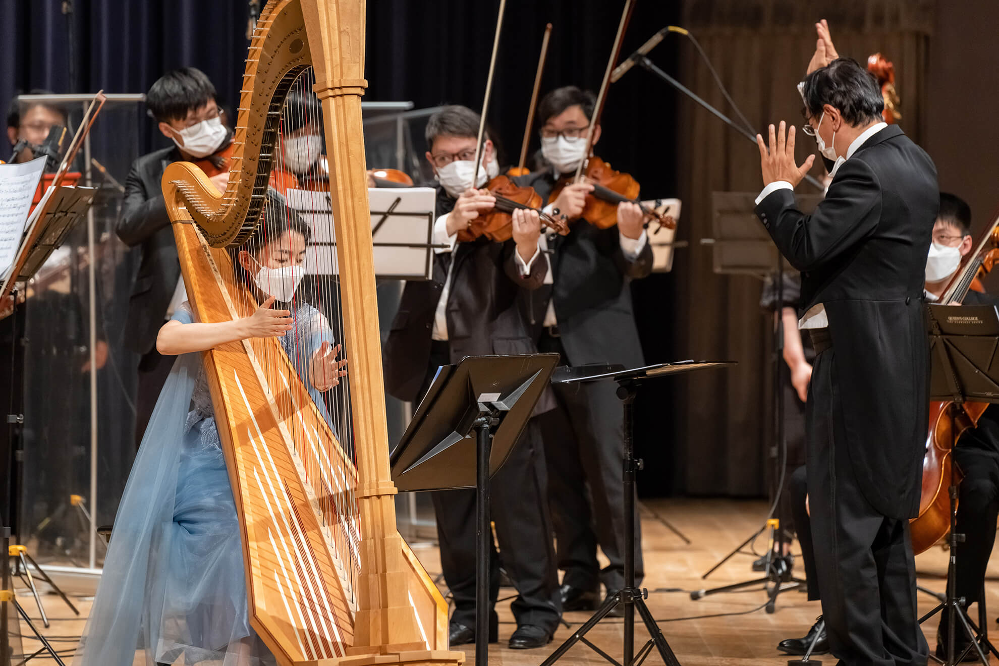 The opening concert was brought by world-renowned harpists Ms. Dan YU and Ms. Lauyee YEUNG, together with the CityU Philharmonic Orchestra. An array of classical pieces, including Saint-Sa?ns's masterpiece, Morceau de concert for Harp and Orchestra in G, Op.154, were presented, drawing a full house of more than 520 audiences. This masterpiece was also the first to debut in Hong Kong! Toward the end of the show, Ms. YU returned to the stage and encored a Chinese song, Blossoms on a Moonlit River in Spring, with a harp in response to the audience's overwhelming applause and summarizing this unforgettable evening.