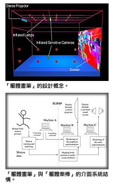 「軀體畫筆」和「軀體樂棒」由葉豪盛教授和藝術(shù)家楊曦先生以及研究生鄧智聰先生共同開發(fā),旨在利用先進(jìn)的視聽表現(xiàn)技術(shù)將軀體動(dòng)作轉(zhuǎn)化爲(wèi)三維繪畫和音樂。該系統(tǒng)由一個(gè)三維動(dòng)態(tài)捕捉系統(tǒng)構(gòu)成,輔之於前置紅外光照明電腦視覺技術(shù)。這個(gè)動(dòng)態(tài)捕捉系統(tǒng)分析技術(shù)能夠提供諸如三維身體位置、運(yùn)動(dòng)速度、身體尺寸變動(dòng)以及多人動(dòng)態(tài)捕捉等資料。“軀體畫筆”可以將身體姿勢(shì)和動(dòng)作路徑歸納爲(wèi)一系列的視覺元素,從而將整個(gè)身體轉(zhuǎn)化爲(wèi)一支動(dòng)態(tài)的畫筆。“軀體樂棒”的原理一樣,利用聽覺元素將人體轉(zhuǎn)化爲(wèi)數(shù)碼樂棒。例如,舉起手,音調(diào)可升高,而伸展手臂則可以控制音量。