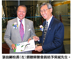 吳先生對(duì)書(shū)籍的熱愛(ài)令校長(zhǎng)張信剛教授深受感動(dòng),除了答謝吳先生的慷慨捐贈(zèng),張校長(zhǎng)也向吳先生為大學(xué)發(fā)展作出的貢獻(xiàn)表示感激。同時(shí),張校張也特別表?yè)P(yáng)了校董會(huì)秘書(shū)杜國(guó)維先生、鄭錦泉教授及俞肇熊教授在擔(dān)任署理館長(zhǎng)期間,帶領(lǐng)圖書(shū)館邁進(jìn)新里程。「我們的圖書(shū)館剛完成裝修,學(xué)術(shù)氛圍
