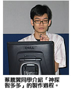 機構製作宣傳片及動畫。透過這些機會,同學們可以融會理論和知識,從中吸取實際經驗,加深對外界的要求和工作方式的認識,對日後投身創意工業大有幫助。『神探智多多』的水準不錯,廉政公署也肯定學生的創意。」李少偉先生為學生感到驕傲。「神探智多多」安排於8月2日至13日(逢星期一至五)下午5時05分於翡翠臺播出,歡迎廣大觀眾收看。此外更有故事問答遊戲,歡迎登入智多多廉政頻道(www.smallcampus.net/icac/)瀏覽。