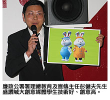 要向兒童推廣廉潔的訊息,單靠說故事或以一般卡通片集作宣傳,也許吸引力未必足夠;假如能夠塑造一些可愛鮮明並深入民心的卡通人物協助推廣,再加上由年青人去構思和製作,相信一定相得益彰,成效和感染力都會大大提高。