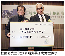 「春天舞臺並給予創(chuàng)意媒體學(xué)院學(xué)生寶貴的學(xué)習(xí)機會,讓他們把創(chuàng)作意念和科技融滙在選段表演當(dāng)中,足證春天舞臺熱心推動創(chuàng)意藝術(shù)發(fā)展,而城大亦會繼續(xù)與業(yè)界緊密合作,推展及建立更多夥伴關(guān)係及具創(chuàng)意的合作項目,」張教授續(xù)道。創(chuàng)立於1995年的春天舞臺乃劇壇及創(chuàng)意工業(yè)界的翹楚,經(jīng)常舉辦教育劇場並到海外巡迴演出。是次春天舞臺捐贈100萬港元予城大,當(dāng)中80萬港元捐款撥歸創(chuàng)意媒體學(xué)院成立「春天舞臺內(nèi)地學(xué)生獎學(xué)金」,獎勵成績優(yōu)異或別具才華的內(nèi)地學(xué)生就讀創(chuàng)意媒體學(xué)院的學(xué)士學(xué)位課程;另外的20萬港元捐款則用作設(shè)立「春天舞臺外展獎學(xué)金」,以贊助學(xué)院學(xué)生參與國際性的藝術(shù)節(jié)及研討會,或與他們所修讀的課程及未來事業(yè)發(fā)展息息相關(guān)的外展活動。