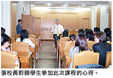 張校長對於同學參加這次實地考察的觀察和體驗特別關注。一位同學說﹕「每天一大早,山東大學就有很多學生在校園的樹林裡看書,或者是聽英國廣播電臺的節目學英文。我們在香港常常到將近九點才上學。與內地學生的勤奮比較起來,我們實在覺得很慚愧!」;另一位同學忍不住補充道﹕「內地大學的物質條件和環境、交通等等,都遠不如香港,宿舍是8個人共用一個房間,連裝水也很不方便。這讓我體會到做一個香港學生實在很幸福。」就這些切身的感受,張校長提醒同學不要身在福中不知福。他勉勵同學﹕「香港是全世界最富裕的地方之一,我們一定要好自為之,不要令香港衰退下去。」 今年就讀會計學系二年級的林莉莉同學,把握這個難得與校長直接對話的機會,以英文向校長提問。她說﹕「每一位進入城大的學生,都被要求在畢業前修畢6個學分的中國文化中心課程。我雖然自己很喜歡與中國文化有關的課程,可是請問為什麼不讓學生選修,而要規定為必修?」認識中國文化的核心價值