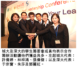 城大學生籌委會主席張偉傑同學說:「雖然香港和深圳只是一河之隔,但兩地不論在語言、處事方式、溝通模式等方面,均有著極大的差異。透過籌組活動,我體會到雙方需要主動了解、互相遷就,方能衷誠合作。」張同學與籌委會成員相處數月後,更領悟到領袖必須高瞻遠矚、要有自信和願意積極付出。