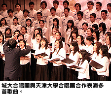 城大合唱團和天津大學北洋合唱團在是晚音樂會上合作表演五首歌曲,包括Tonight(夢斷城西)、城市傳奇、茉莉花、美麗的草原是我家及Praise His Holy Name。另天津大學北洋合唱團獻上多首中外名曲。