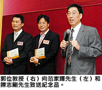 晚宴上,郭教授略述了城大未來(lái)發(fā)展大計(jì),同時(shí)感謝校友多年來(lái)對(duì)母校的鼎力支持,並希望他們繼續(xù)協(xié)助母校的長(zhǎng)遠(yuǎn)發(fā)展。發(fā)展及校友聯(lián)絡(luò)處處長(zhǎng)陳燕玲女士說(shuō):「城大校友遍佈四海,我們致力與世界各地的校友保持緊密的聯(lián)繋,並於海內(nèi)外積極舉辦各項(xiàng)校友活動(dòng),以加強(qiáng)凝聚,鞏固強(qiáng)大的校友網(wǎng)絡(luò)。」此外,她又呼籲校友支持大學(xué)將為25周年校慶舉辦的各項(xiàng)活動(dòng)。晚宴特別訂製了直徑達(dá)16吋巨型月餅,與校友一同分享,藉著慶團(tuán)圓加強(qiáng)聯(lián)繫。此外,郭教授更向兩名校友陳志剛先生及范家輝先生致送紀(jì)念品,答謝他們多年來(lái)對(duì)母校的慷慨捐獻(xiàn)。他們同時(shí)是「校友捐獻(xiàn)會(huì)」成員和「校友聯(lián)絡(luò)大使」,當(dāng)晚親力親為,呼籲校友以自己為「城大畢業(yè)生」為傲及支持近日推出的「心繫城大──心意卡」活動(dòng),席間得到校友的熱烈響應(yīng)。