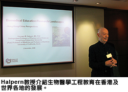 隨後,香港理工大學藥理學傑出教授Georges M Halpern教授介紹了香港、內地以及全球的生物醫學工程教育情況。Halpern教授概述了香港及外國院校開設的最新生物醫學課程,以及香港在生物醫學工程教育的發展潛力。