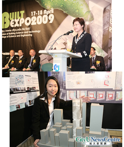 香港城市大學(xué)建築科技學(xué)部於4月17日舉行為期兩天的「建築科技博覽2009」,並邀得發(fā)展局局長林鄭月娥女士(上)主持開幕儀式。本年度主題為「建築環(huán)境更生」,展出作品包括綜合商業(yè)大樓設(shè)計、大廈改裝計劃、活化舊建築等。建築學(xué)副理學(xué)士課程學(xué)生陳曉玲(下)的銅鑼灣商業(yè)大廈設(shè)計,因巧妙融匯時裝設(shè)計概念及環(huán)保元素,獲得學(xué)生畢業(yè)作品獎冠軍。她運用層層交疊的斜道為大廈結(jié)構(gòu)增添層次感,就像流行時裝中的層次穿搭,並以鋁網(wǎng)包圍大廈,既可阻擋猛烈的陽光又能引入自然光,創(chuàng)造出環(huán)保時尚的大廈設(shè)計作品。