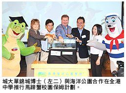 香港城市大學(城大)與香港海洋公園學院及香港海洋公園保育基金合作,在全港中學推行首項馬蹄蟹校園保姆計劃。合作各方都希望透過該計劃提高公眾對馬蹄蟹保育的關注。