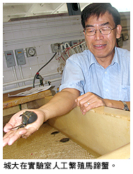 城大自2006年起和香港海洋公園保育基金合作,從事馬蹄蟹研究及保育工作,其中包括收集馬蹄蟹在港棲息情況的科學數據,爭取馬蹄蟹在港列入受保護物種,並提高市民保護自然環境的意識,以免馬蹄蟹及其他珍貴物種的棲息地受到破壞。城大與香港海洋公園保育基金研究人員更於去年9月在大嶼山水口放生20隻人工繁殖的馬蹄蟹,並利用植入的晶片監察其生長情況。