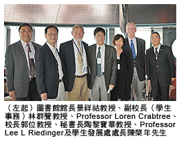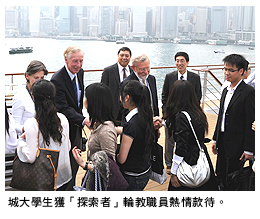 這次登船訪問由本次航程的執(zhí)行院長Loren Crabtree教授和物理科目教師Lee L Riedinger教授安排。他們是城大校長郭位教授在美國時(shí)的同事。「探索者」輪是於上海短暫逗留後23日抵達(dá)香港,在港期間停泊在海運(yùn)大廈郵輪碼頭。曾經(jīng)擔(dān)任田納西大學(xué)校長的Crabtree教授一到埠即帶領(lǐng)教師與學(xué)生來城大拜訪,並高度讚賞城大圖書館別致的設(shè)計(jì)及設(shè)備。