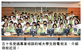五十名來自各個學系的香港城市大學(城大)學生,從6月下旬開始致電一萬多名校友,介紹母校的最新進展,藉此聯絡情誼,凝聚歸屬感,同時為大學籌款。