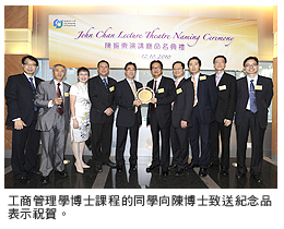 繼2006年在城大取得行政人員工商管理碩士(EMBA)學(xué)位後,陳博士在2009年修畢商學(xué)院工商管理學(xué)博士課程(DBA),成為該課程的首名畢業(yè)生。陳博士對(duì)推動(dòng)城大發(fā)展不遺餘力。早年,他應(yīng)商學(xué)院之邀而擔(dān)任特約教授,與學(xué)生分享多年來(lái)在服裝行業(yè)累積的實(shí)務(wù)經(jīng)驗(yàn)和創(chuàng)業(yè)心得。陳博士又與商學(xué)院合作,安排工商管理學(xué)碩士課程(MBA)學(xué)員到自己旗下的公司從事企業(yè)考察,而且成立獎(jiǎng)學(xué)金捐助母校,以嘉獎(jiǎng)成績(jī)優(yōu)異的學(xué)生。