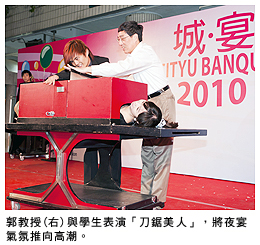 夜宴安排了一項(xiàng)特備節(jié)目,由郭教授上場參與魔術(shù)表演。當(dāng)郭教授與學(xué)生表演「刀鋸美人」時(shí),所有學(xué)生高聲歡呼,把夜宴的氣氛推向最高潮。