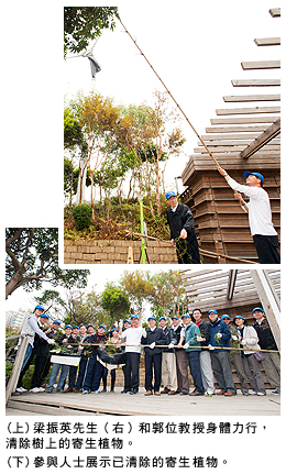 啟動禮後,梁先生和郭教授率領部分出席人士前往馬灣公園,清除無根藤等寄生植物和雜草,以助樹木正常生長,減輕對環境的危害。寄生植物主要為藤蔓類的攀援植物,繁殖力極強,以榨取宿主植物(host)體內的養分維生,往往致使宿主逐漸枯萎甚至死亡;而野生雜草則會危害農作物,破壞環境。