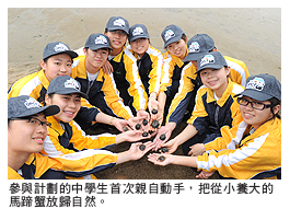 約120名來自10間中學(xué)的學(xué)生4月17日來到香港西北部的下白泥,在這具生態(tài)價(jià)值的濕地將一百多隻馬蹄蟹放歸大自然,標(biāo)誌香港城市大學(xué)(城大)與香港海洋公園合作推行的馬蹄蟹保育研究工作邁出成功的一步。