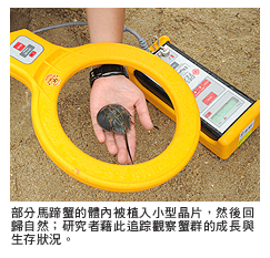 城大早於2006年便開始與保育基金合作,研究改善人工繁殖及培育馬蹄蟹的技術(shù),並改善馬蹄蟹的維生系統(tǒng)。位於深灣海岸的下白泥濕地是香港馬蹄蟹的原棲息地,研究者在部分馬蹄蟹體內(nèi)植入小型晶片,然後放歸自然,隨後藉此偵測蟹群的成長過程與生存狀況。研究員將於未來六個(gè)月內(nèi),每隔兩星期重訪放生之地的泥灘,檢查回歸野外的馬蹄蟹之生存狀況。