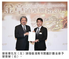 AYP計(jì)劃要求參加者在社會(huì)服務(wù)、技能、野外鍛鍊、康樂體育、團(tuán)體生活各方面都達(dá)到規(guī)定的要求。我獲得銀章之後,立即接受挑戰(zhàn)以爭(zhēng)取金章,如今終於成功。從香港特別行政區(qū)署理行政長(zhǎng)官曾俊華先生手中接過金獎(jiǎng)?wù)履且豢蹋惹皡⑴c該計(jì)劃及社會(huì)服務(wù)的種種歷程浮現(xiàn)眼前,別有感受。