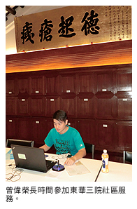 我亦長(zhǎng)時(shí)間參與東華三院主辦的多項(xiàng)社區(qū)服務(wù),除了參加直接幫助弱勢(shì)社群的活動(dòng),還在「香江有情:東華三院與華人社會(huì)」的展覽中擔(dān)任大使,協(xié)助宣傳本地歷史文化,既加深了對(duì)香港的認(rèn)識(shí),堅(jiān)定了促進(jìn)社會(huì)的決心,又結(jié)識(shí)了各界人士,例如東華三院前主席梁定宇先生,得以了解許多人與事,開拓了視野。