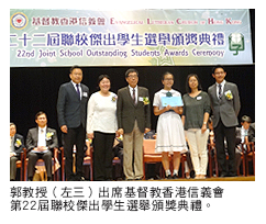 郭教授5月22日出席基督教香港信義會(huì)第22屆聯(lián)校傑出學(xué)生選舉頒獎(jiǎng)典禮。香港信義會(huì)轄下共10間中小學(xué)參加這項(xiàng)活動(dòng)。郭教授致詞時(shí)勉勵(lì)學(xué)生養(yǎng)成良好的態(tài)度。他說(shuō):「學(xué)位不如學(xué)識(shí)重要,學(xué)識(shí)不如經(jīng)驗(yàn)重要。失敗乃成功之母,從失敗中吸取經(jīng)驗(yàn),就能發(fā)揮潛力,獲得成就,對(duì)社會(huì)有貢獻(xiàn)。」